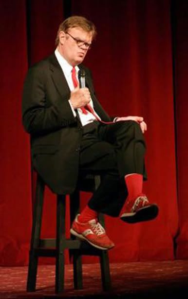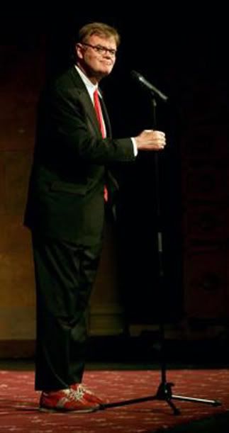 ALLEN: The performance was on Valentine's Day, so Keillor let out his romantic side. He spoke of early loves and longings. He also wore a nifty set of red sneakers and a red tie for the occasion.